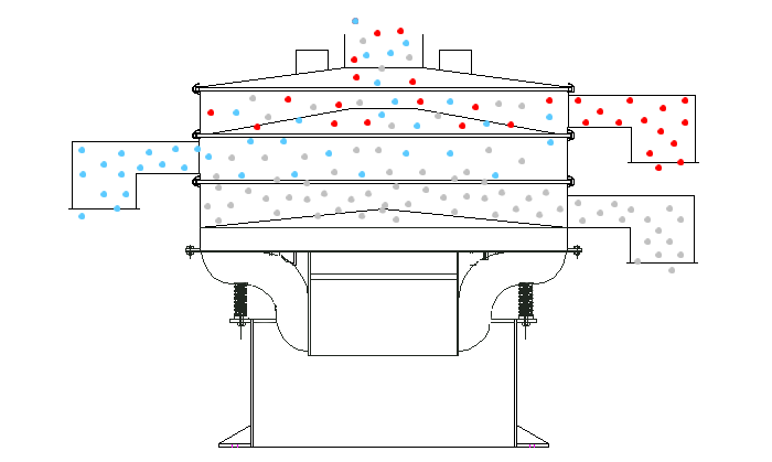 ★水平與垂直加速度隨著粒子的運動而增加,接近篩孔尺寸的顆粒隨之成功分離;較大顆粒被運到出口處,出口處由一個可調節的導向裝置控制流量,該導向裝置是控制物料停留時間的另一個因素。